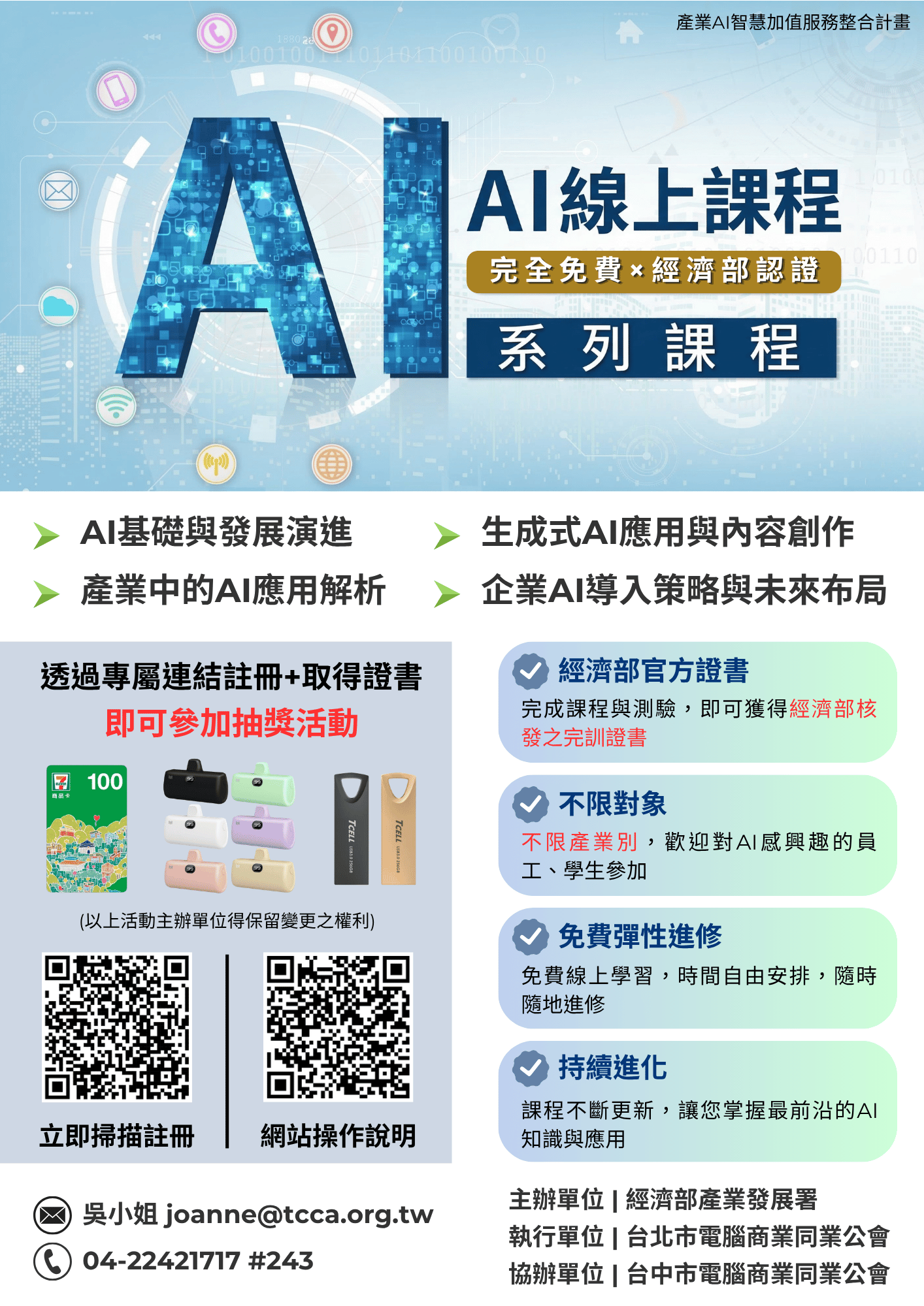 【轉知】台中市電腦商業同業公會提供免費政府資源「AI線上課程平台」,歡迎踴躍參與!